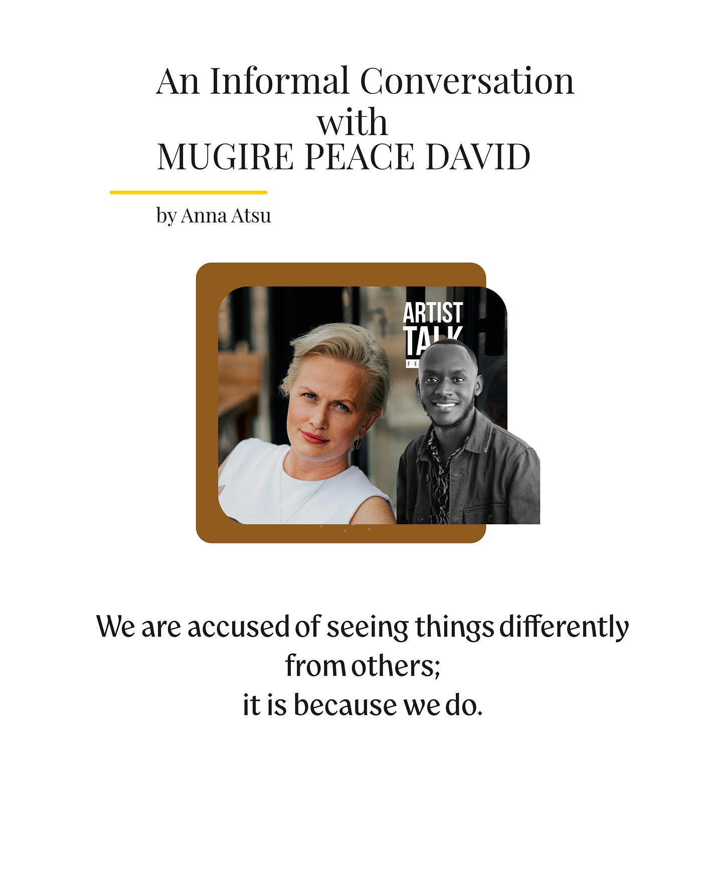I had a friend in Belgium. She’s a very good lady and a good friend of mine. She has PhD in psychology. So she asked, ‘David, tell me more about your story, about what you’ve been through, about everything’. So we, we had a conversation, a very good conversation. And after a while, she was like, ‘I asked you that question so that I can try to reflect on the work that you do.’ Cause, you know, sometimes artists cannot really explain what they’re doing, it just comes naturally, an expression of the things. So when you hear about what they have been through, you can be like, oh, OK, now I get it. So I think that’s my, my, my perspective on love. Bring the kids a lot. Yeah. It’s just my life, what I have been through as a kid.
