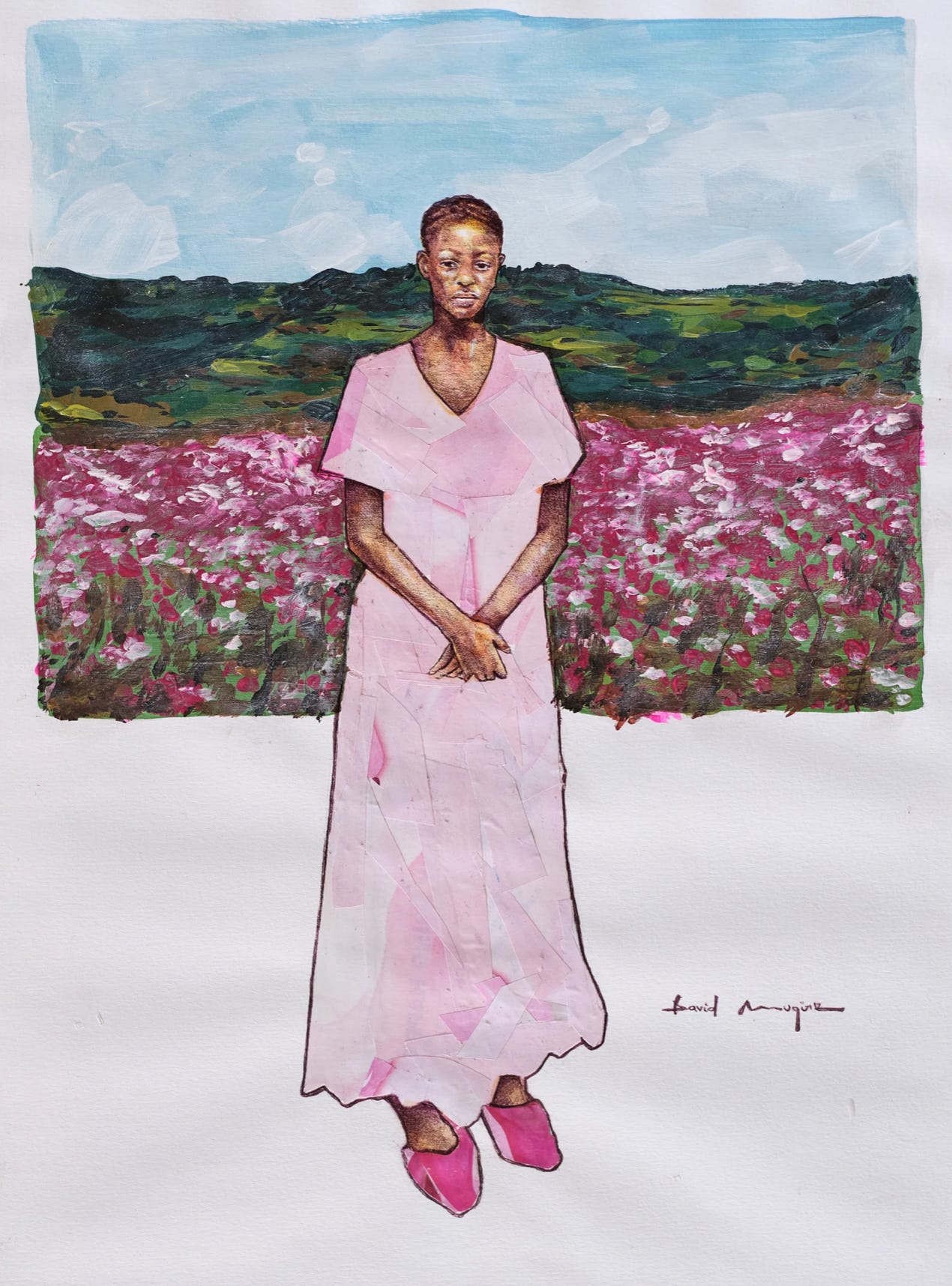 People have been asking me why I love painting male figures. Why are you into it a lot? And there was like, you know, let me try to challenge myself to work with the female figures, to hear their stories. And I think currently, I’m loving them a lot. So in that particular work, many different women love pink, so I went to explain the feminine energy, trying to romanticise it with a very good dress, the flowers and everything, yeah. I do believe that every woman should feel like a queen.