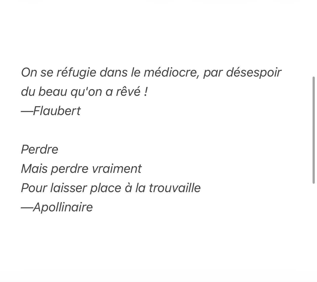 You are thinking of your first notebook (no, not a computer), a paper cahier de brouillon (not bouillon—I might serve the soup later, though), where you copied all the interesting quotes. We do not talk about books. I was never in any kind of adult book club. I am not sure how I would bear the whole concept, not even thinking of its implications. I bring my old notebook and pass it to you. You open it on the first page. You read (in French):