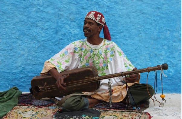 Even the music was made to serve a colonial logic of difference. The guembri, a deep, rectangular lute, was called a relic of slavery — an “African bass” that somehow travelled northward.