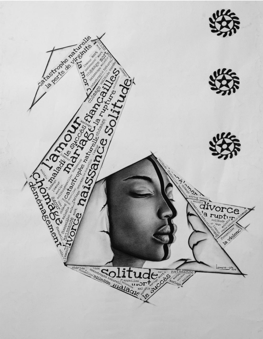 I never had the opportunity to study art formally, but my passion and determination have allowed me to grow. Over time, I developed a style I call “my handwriting” — a combination of hyperrealistic charcoal drawings and handwritten collage. It’s my personal language, a deep way of conveying what I feel.