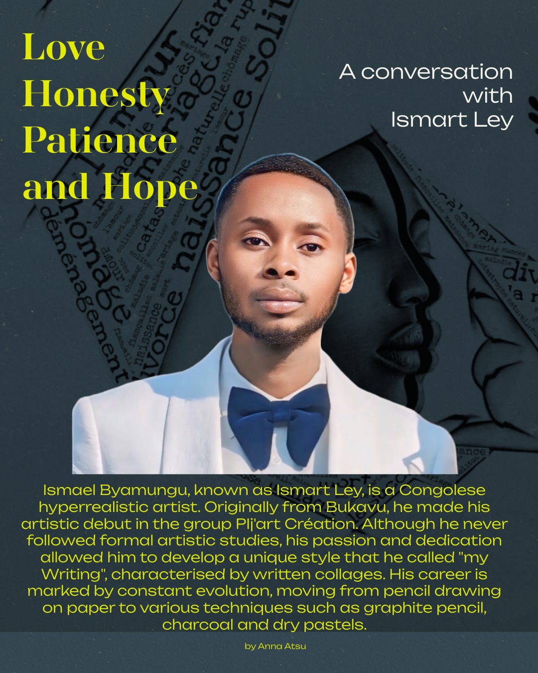 Ismael Byamungu, known as Ismart Ley, is a Congolese hyperrealistic artist. Originally from Bukavu, he made his artistic debut in the group PIj’art Création. Although he never pursued formal artistic studies, his passion and dedication allowed him to develop a unique style that he called “my Writing,” characterised by written collages. His career is marked by constant evolution, from pencil drawing on paper to various techniques such as graphite pencil, charcoal, and dry pastels.